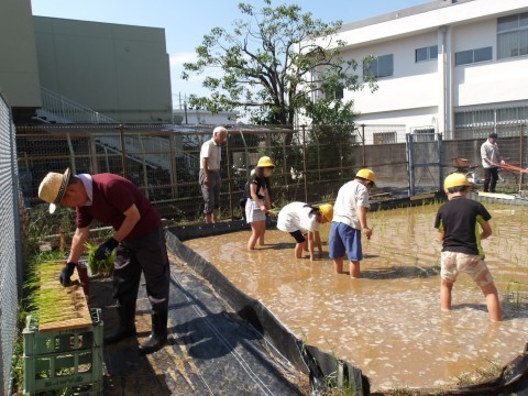 先日は雨でできなかったクラスが、地域の方の協力で、田植えをしています。泥の中に足を入れることに抵抗を示していましたが、入ってみると気持ちよく、しるし通りの場所に苗を植えました。