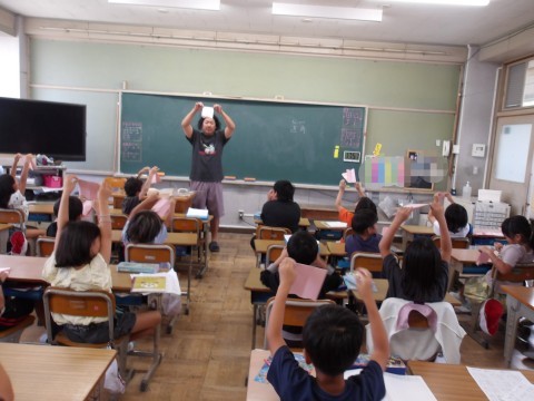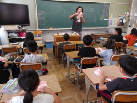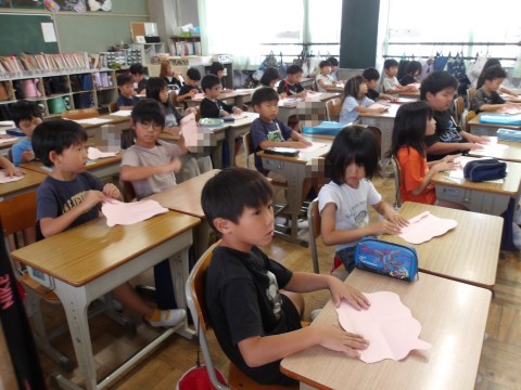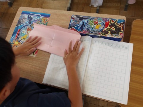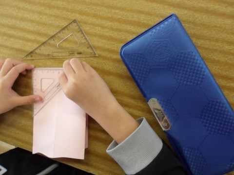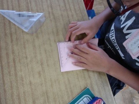 こちらのクラスでは,先生が配布した紙を使って直角を作っています。直角になっているか,三角定規を使って確かめます。いくつできたかな。