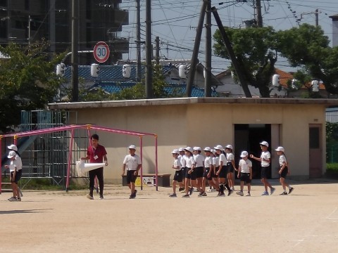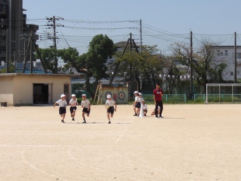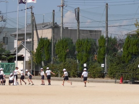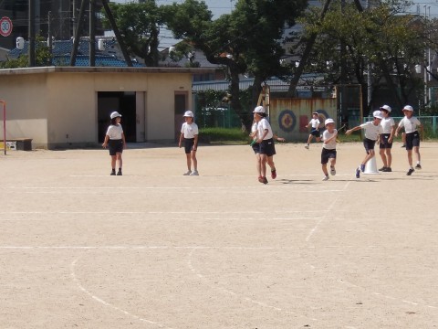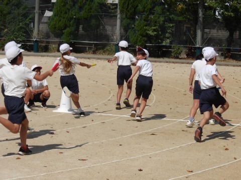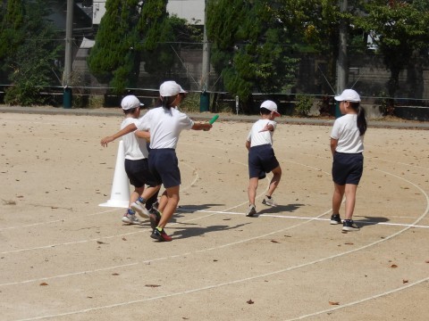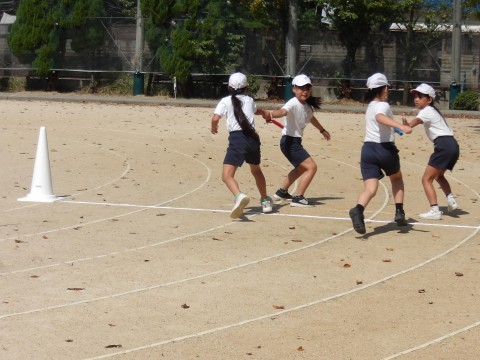 体育では,陸上競技のリレー種目に取り組んでいます。テイクオーバーゾーンを使ってバトンを渡します。
