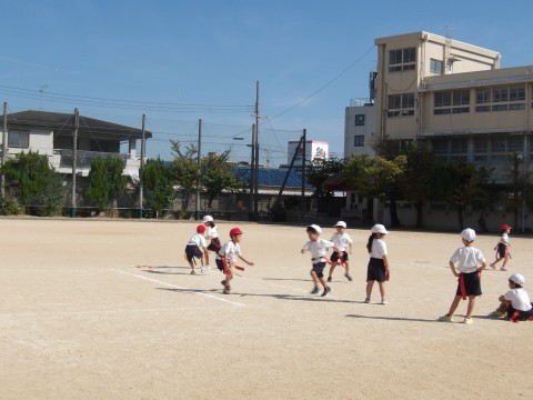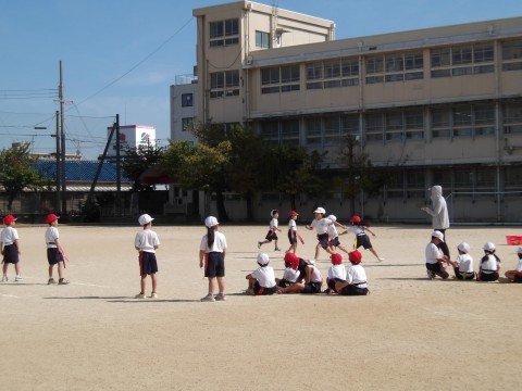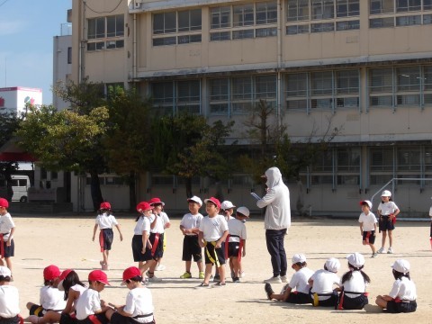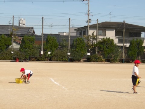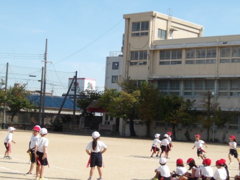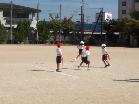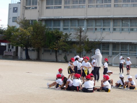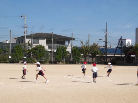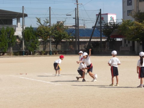 体育では,自分のタグを守り抜きながらボールを自分の陣地に運びます。元気いっぱいに活動しています。