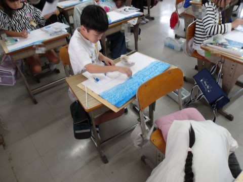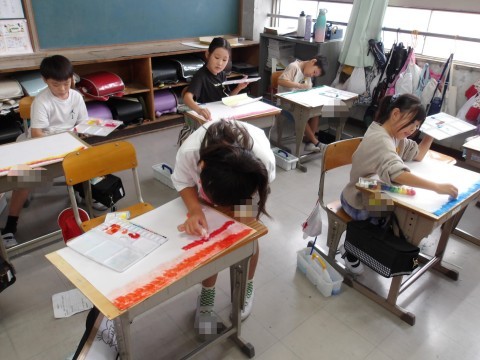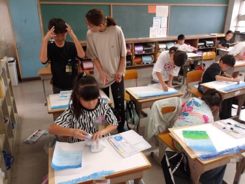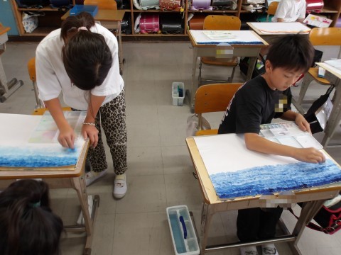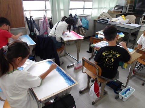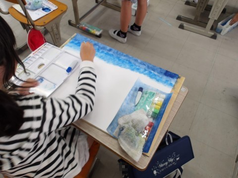 図工展に向けて,「いろとりどり」を制作しています。手形の鳥の羽をお空に放ちます。その空を仕上げています。絵の具を水で良い加減に薄め,スポンジを使ってポンポンと色のせて空を作ります。