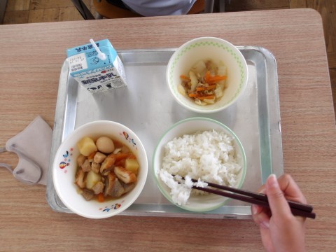 今日の献立「こんぶ入りおでん」では,昆布でだしを取って,そのあと刻んでおでんに入れることで,フードロスを減らしています。まだ食べられる食材は,このように無駄なく使っていきたいものです。