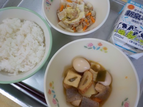 今日の献立は『ごはん・牛乳・こんぶ入りおでん・白菜のおひたし』でした。