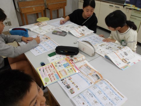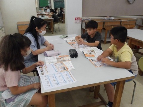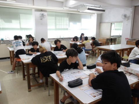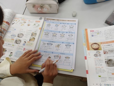 家庭科では,「ご飯とみそ汁」の調理実習を行います。みそ汁は,煮干しからだしを取ります。調理の手順を確かめています。