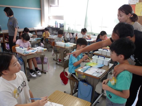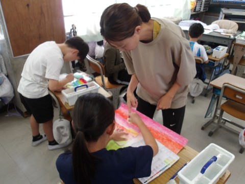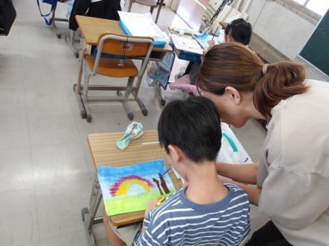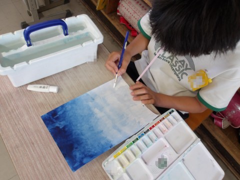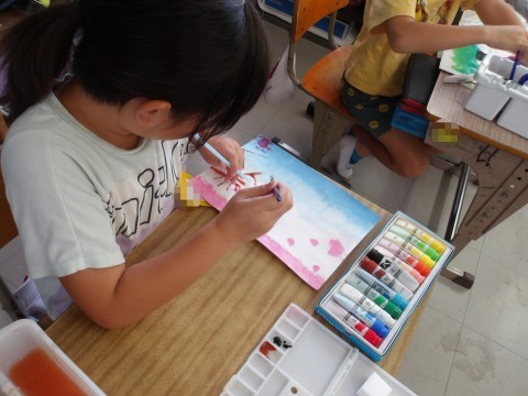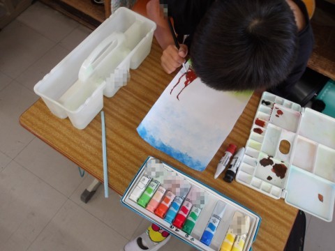 図工では,木の幹や枝を描く練習をしています。ストローを使って描きます。