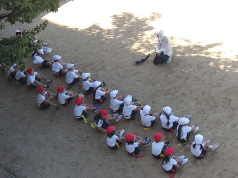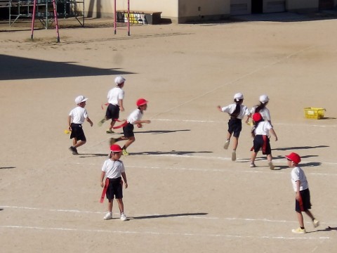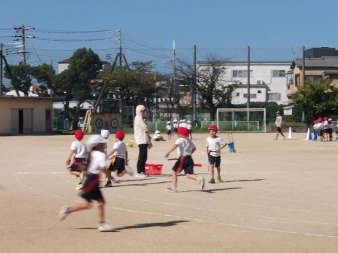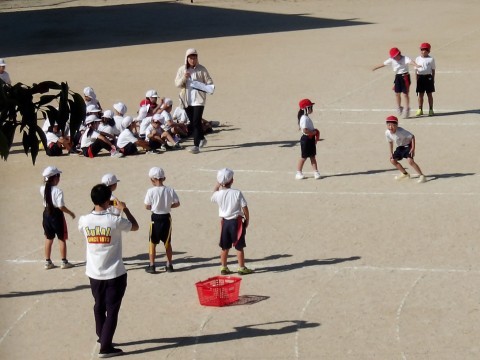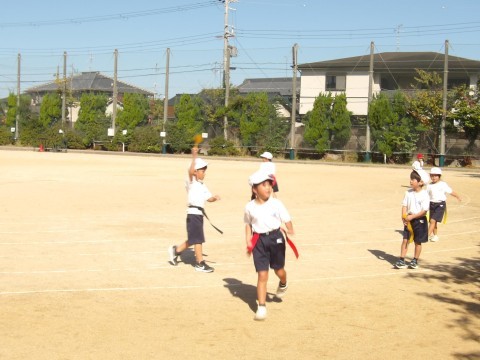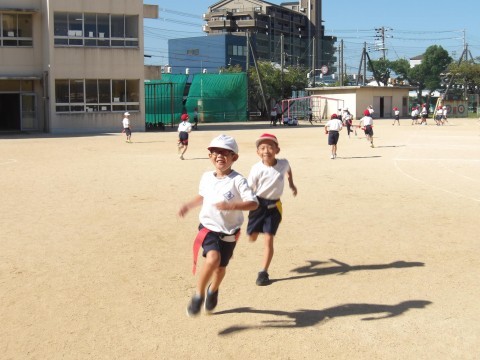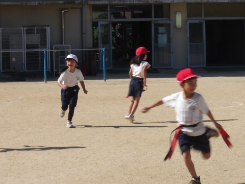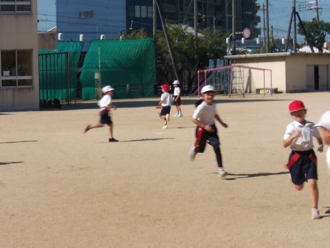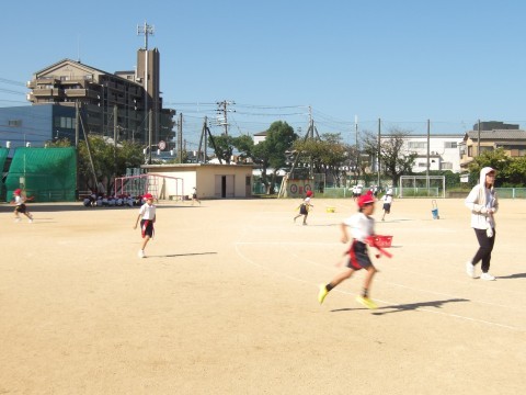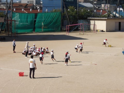 自分のタグを守り抜きながら「宝とり鬼」の活動をしています。いくつ宝を運ぶことができたかな?ゲームの後に,タグ取りの練習をしました。