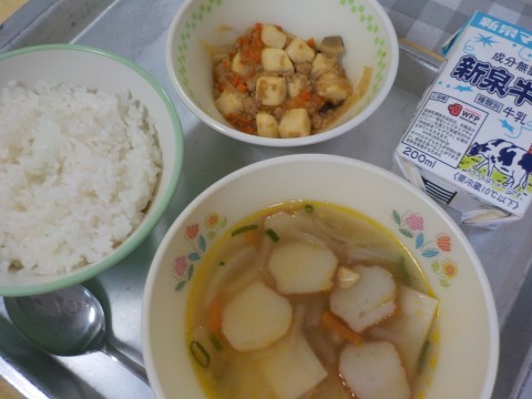 今日の献立は『ごはん・牛乳・ワンタン・麻婆豆腐』でした。
