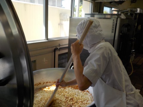 豚肉と野菜を炒めて煮込んだところに,下茹でした豆腐を入れて作っています。食材は,豚肉・にんにく・土しょうが・にんじん・たまねぎ・干しいたけ・豆腐で,調味料は,赤みそ・豆みそ・中華ブイヨン・砂糖・しょうゆ・料理酒・豆板醤・ごま油です。麻婆豆腐は,たくさんの材料を使って作ります。