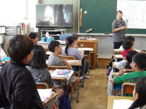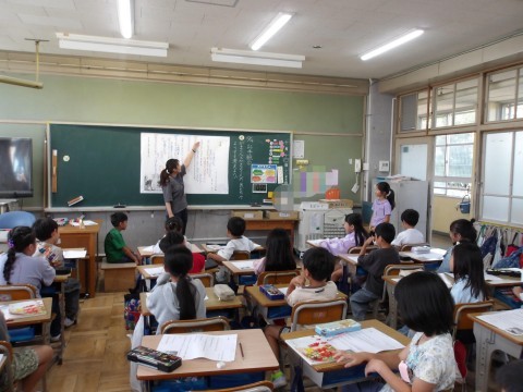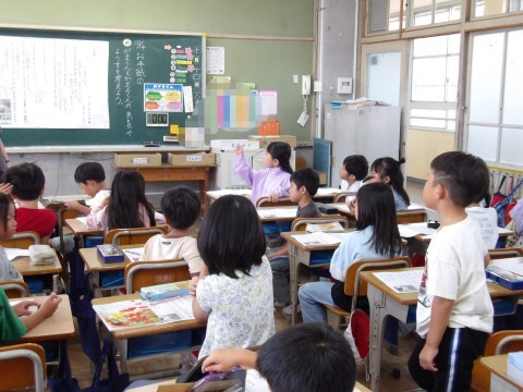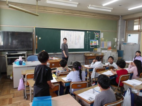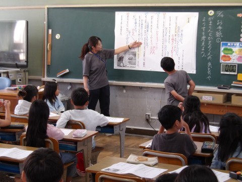 国語「お手紙」では,がまくんとかえるくんの気持ちや様子を考えます。場面を読み取るために,実際にがまくんとかえるくんになって音読しています。“しょんぼりしたように”とか,“いつも通りに遊びに来た感じに”のように,読んでいます。