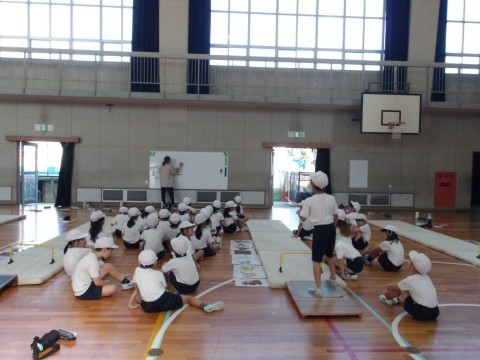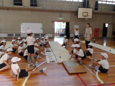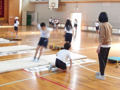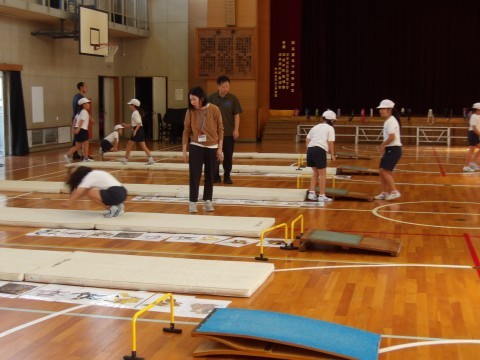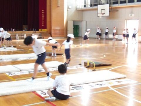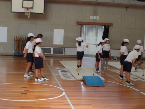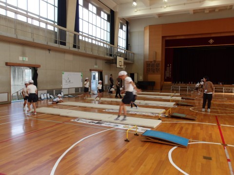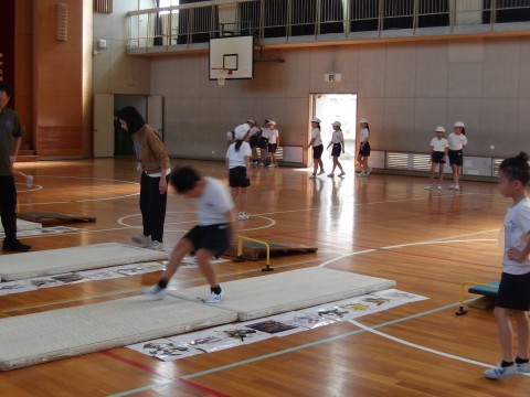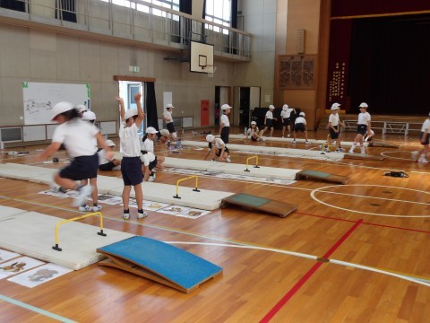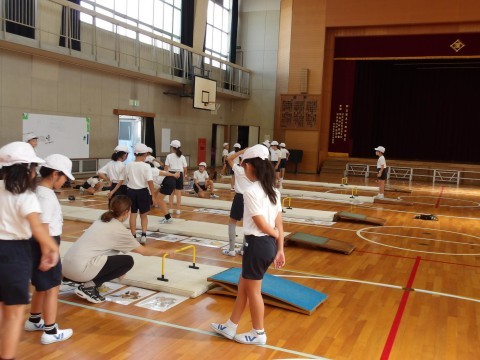 体育館の体育では,幅跳びの学習をしています。踏み切るときに体を高く引き上げるための場の設定をしています。跳べた距離でカードをゲットします。