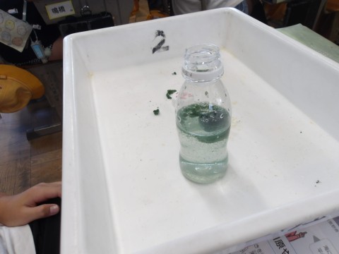 実際にペットボトルに入れたスポンジと水を使って実験しました。