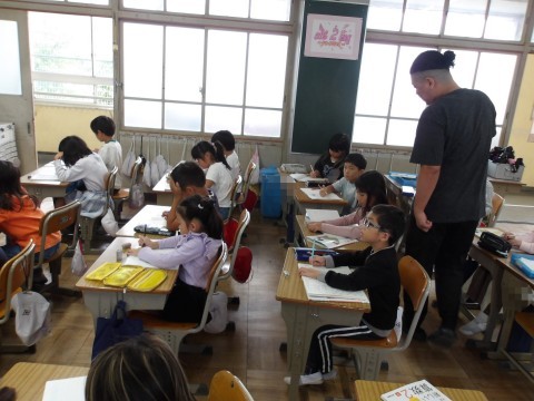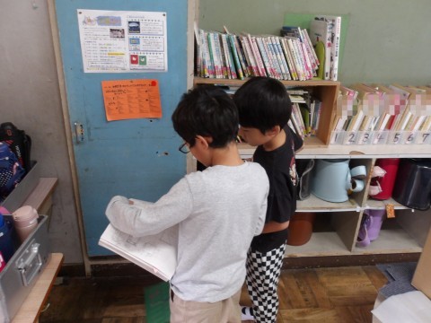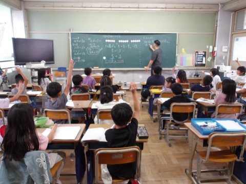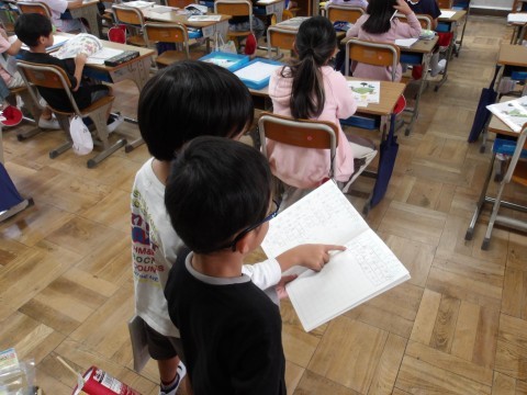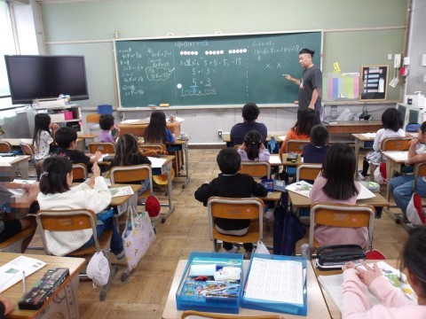 算数では,かけ算の学習に入っています。「1つ分の数×いくつ分」をしっかりと理解して取り組むことが大事です。答えをと考え方を友だちと共有しています。