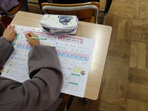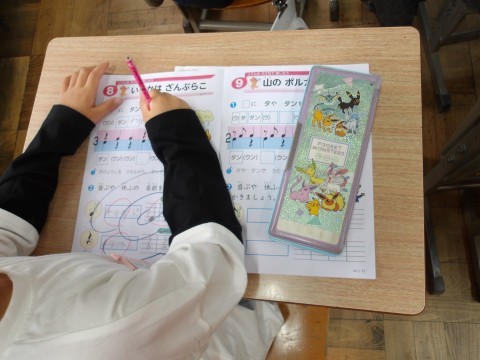 音楽では,「いるかはざんぶらこ」の3拍子の拍にのってリズムを打ちます。それを音符で表しています。