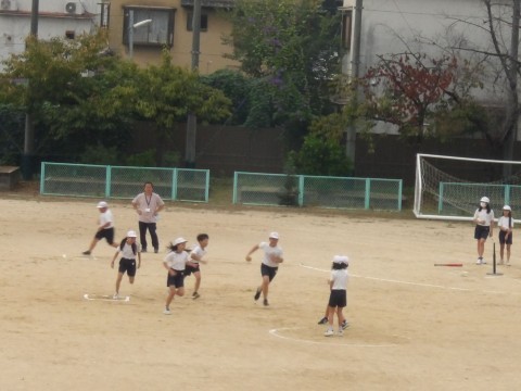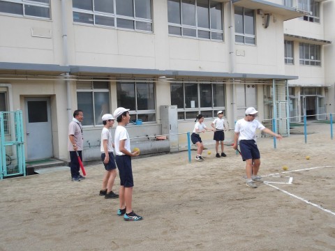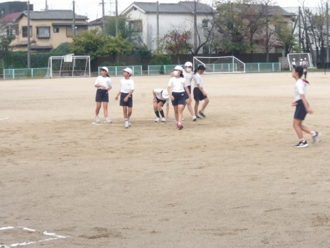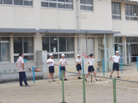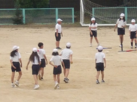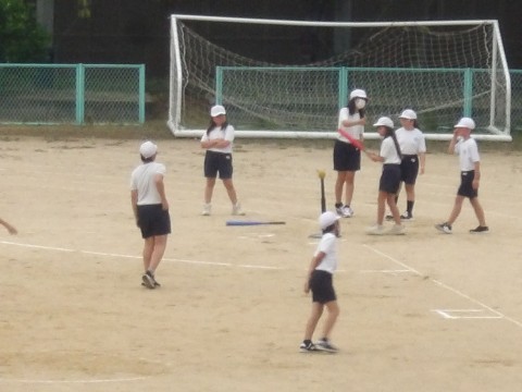 運動場の体育では,「Tバッティング」に取り組んでいます。守備の人たちは,飛んできたボールを声を出し合って処理をしています。