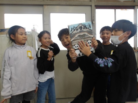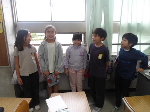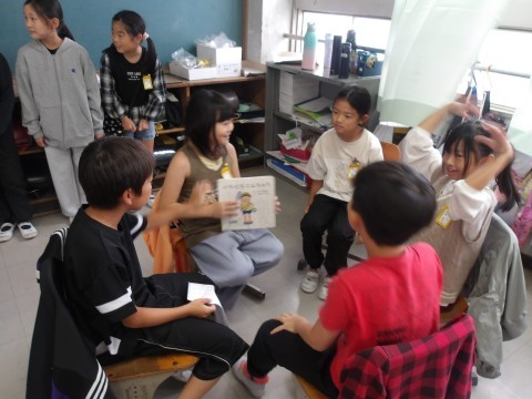 お気に入りの本を1年生に紹介しようと,グループごとに発表の準備をしています。