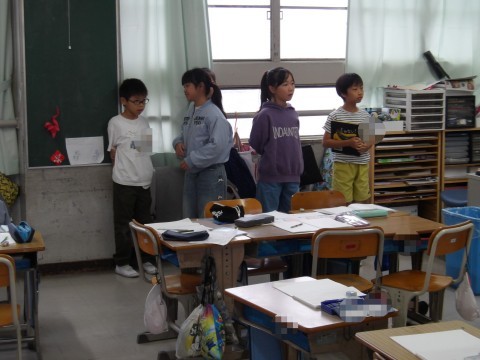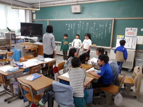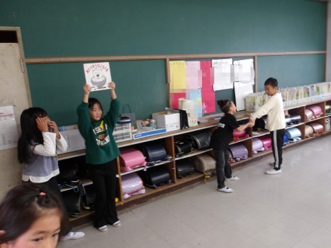 国語「おすすめの1さつをきめよう」では,おすすめの本を1さつを木曜日に1年生に紹介する練習をしています。身振り手振りを入れたり,寸劇風にしたり,質問を投げかける場面を入れたりと,工夫をした発表になっています。