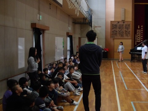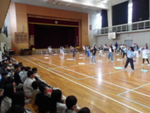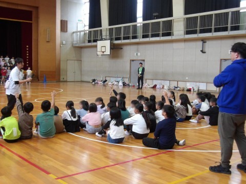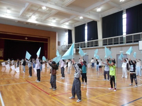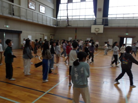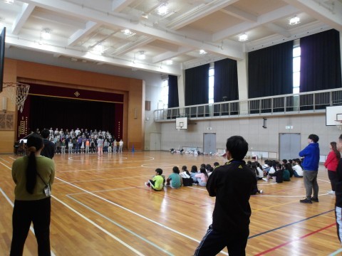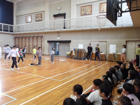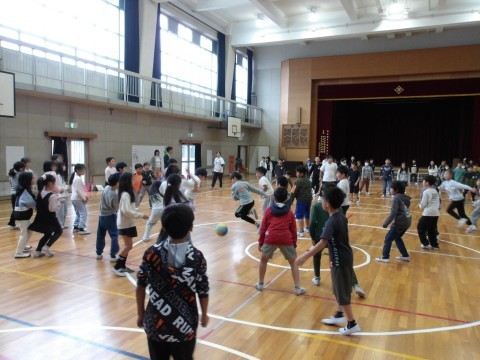 学校群の小小連携として,4年生が,3時間目に体育館で深井西小学校と交流をしました。初めに,深井西小学校の子どもたちが,今週末の体育大会の団体演技を披露してくれました。フラッグをもって力強く演技を行う姿は,かっこよく,素敵でした。深井小学校からは,連合音楽会の合唱を披露しました。初めに,深井小学校のみんなが来てくれたことへの感謝を込めて,大きな声で呼びかけをし,練習の成果を出し切って合唱しました。そのあとは,みんなでドッチボールをして楽しみました。