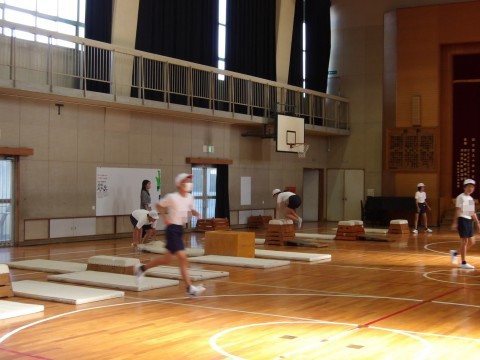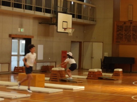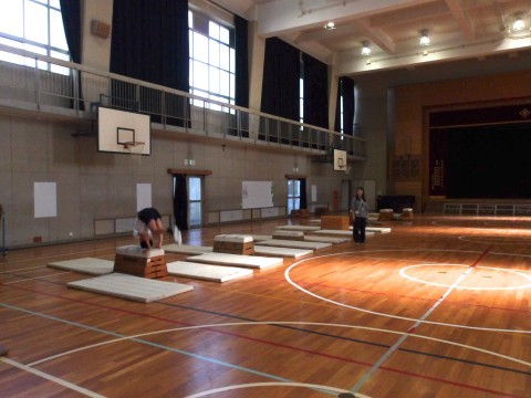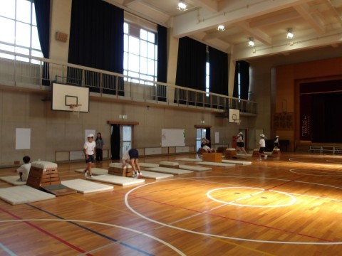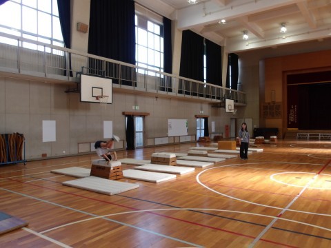 体育館の体育では,マット運動の台上前転の技を練習しています。