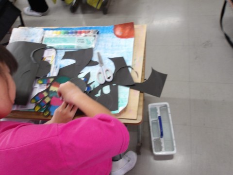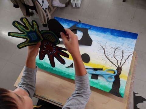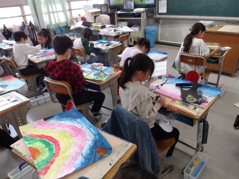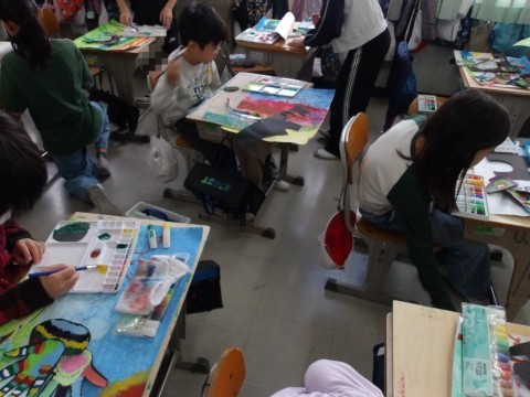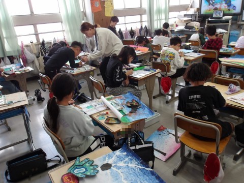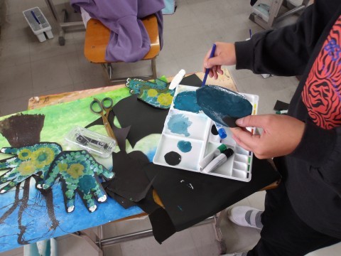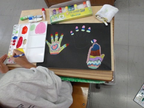 図工展に向けて,「いろとりどり」を制作しています。自分の手形を鳥の羽に見立てて作成し,どのように配置するか思案しています。工夫を凝らしたよい作品がたくさんです。