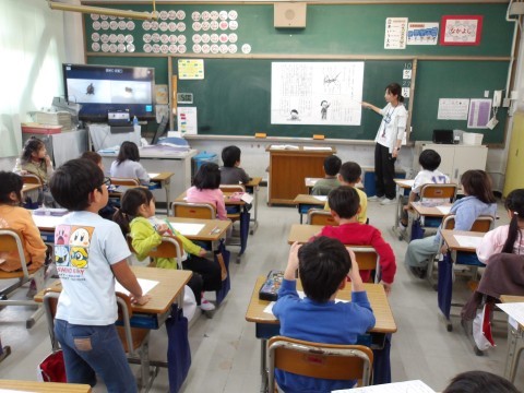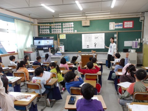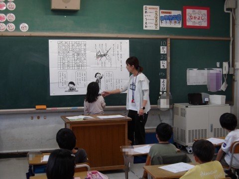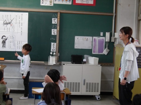 国語では,しらせたいものの絵と,見つけたことを発表しています。たくさんの手があがって,前で発表しています。発表のしかたも,みんなのほうを向いて大きな声で話していて,とても良いです。