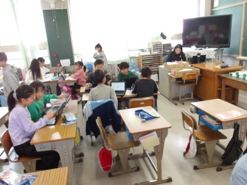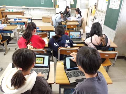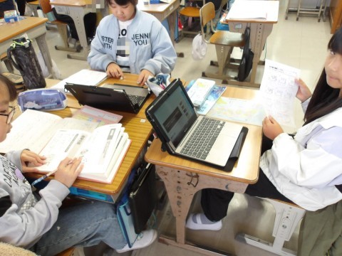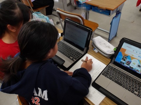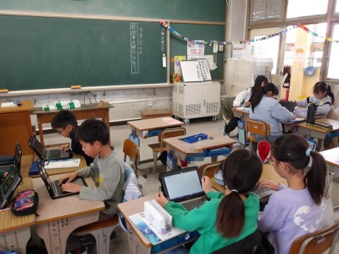 国語では,「故事成語」について学習をしています。どんな故事成語があるか,タブレット端末を使って調べています。