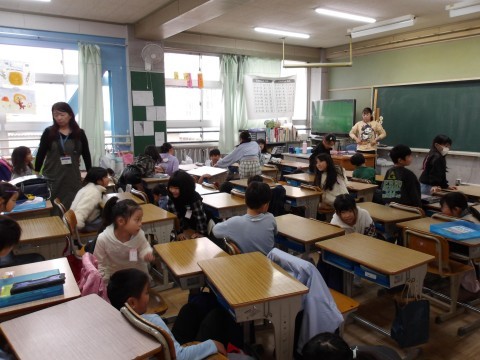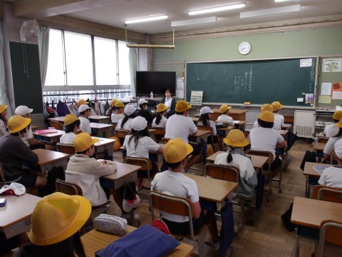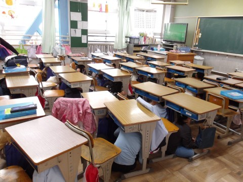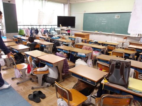 本日10時「大阪880万人訓練」が行われることを受け,8時30分,地震が発生したことを想定し,避難訓練を行いました。この時間は,子どもたちは教室内にいたので,震度6の地震発生の放送とともに,机の下に入って机の脚を対角線上につかんで非難しました。その後,学校長から,「大阪880万人訓練」が始まった経緯やその目的についてと,「災害はいつどこで起こるかわからないので,お家の人と待ち合わせする場所を決めておきましょう。」と話がありました。