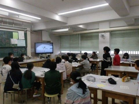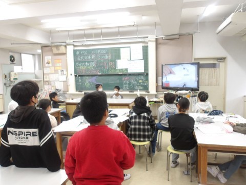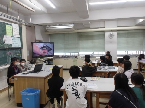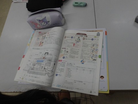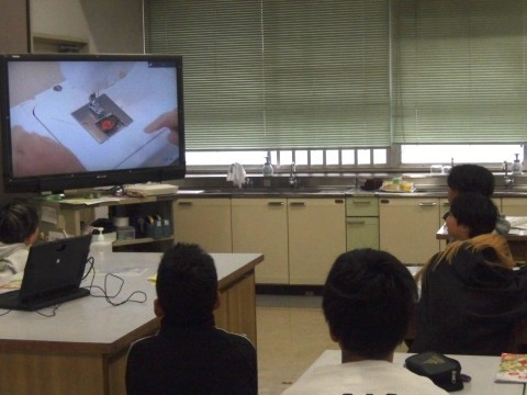 家庭科では,ミシンの学習をしています。映像をみながら,糸通しの順番を確認しています。