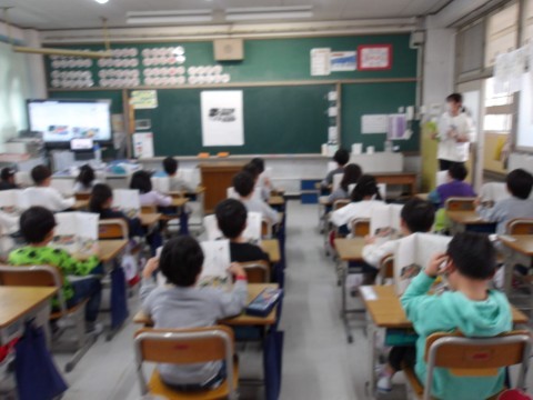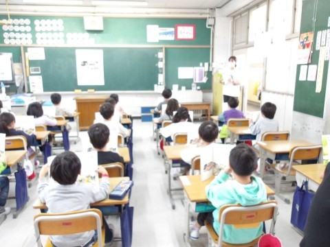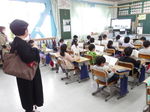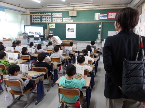 国語「じどうしゃくらべ」の音読をしています。今日は教育長,人事部長が授業を参観されています。