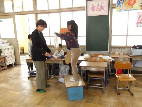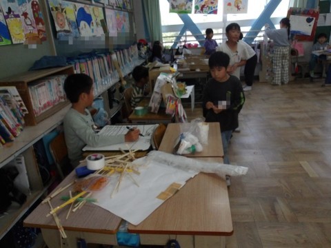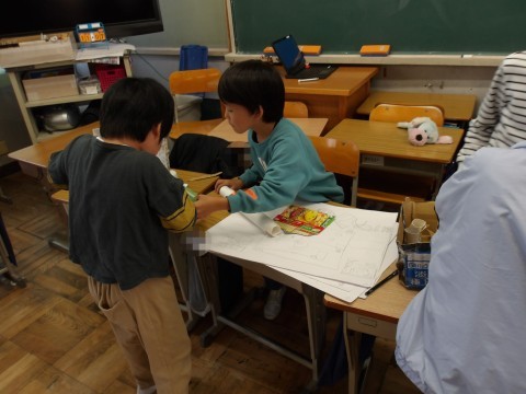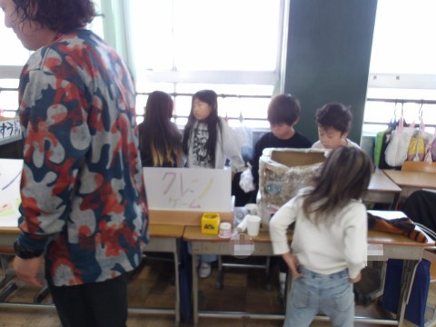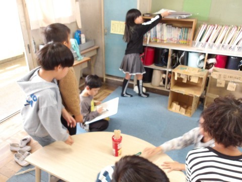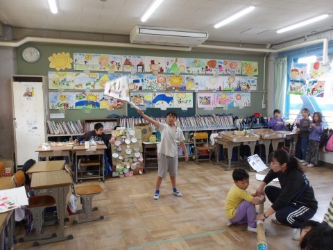 日曜参観で披露する「おもちゃランド」の制作をしています。教育長に,遊び方を説明しています。