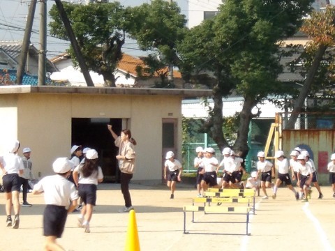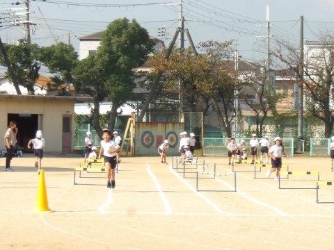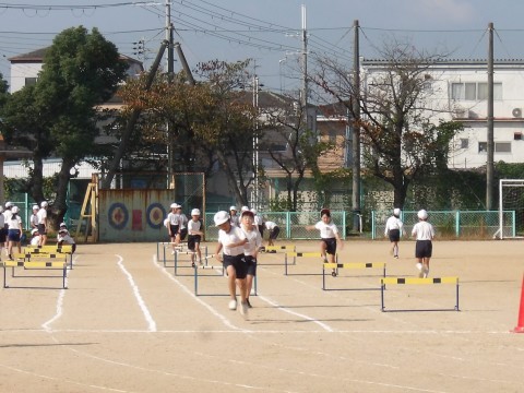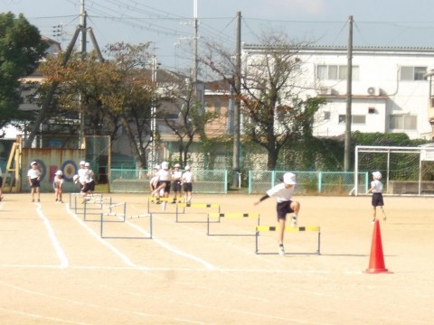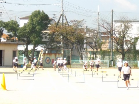 運動場の体育では,ハードル走に取り組んでいます。初めは跳び越えるのが怖いようですが,先生の説明をよく聞いて正しいフォームで取り組むと,スムーズに動くことができるようになってきます。