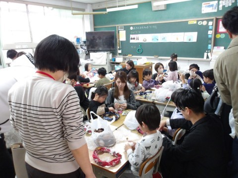 おうちの人とリースづくりをしています。音楽では,タブレット端末を使って授業をしています。