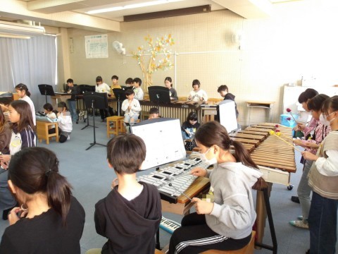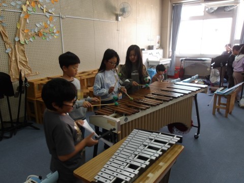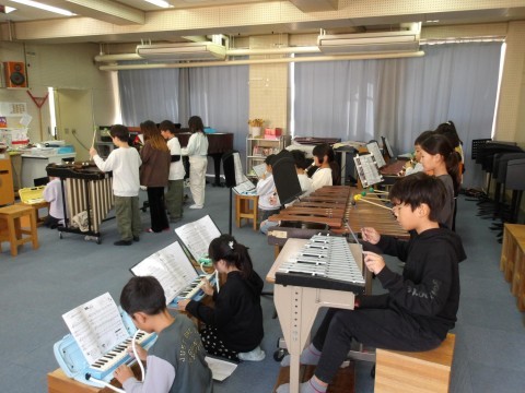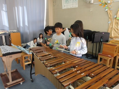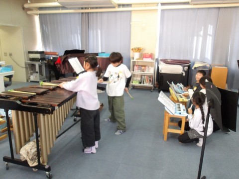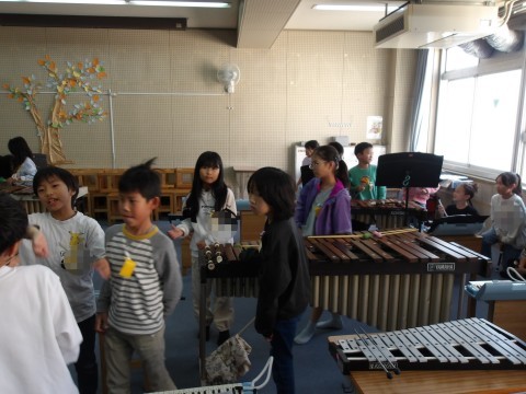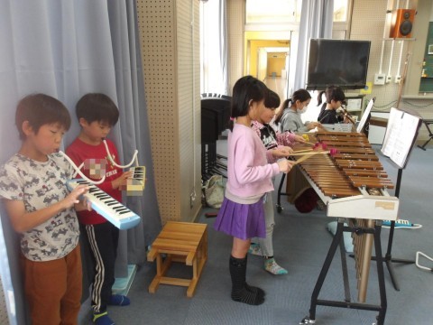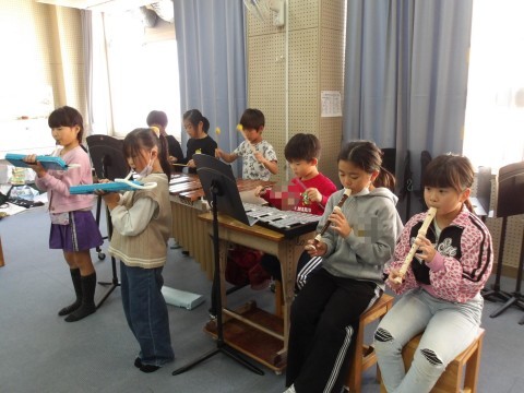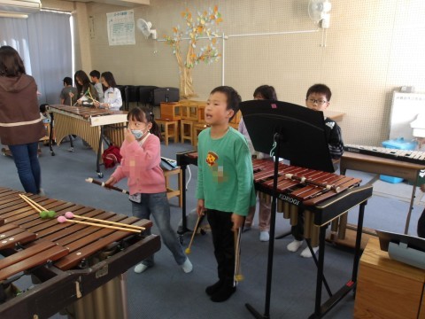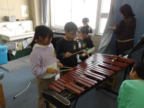 音楽「ゆかいな木きん」では,2拍子にのって演奏します。