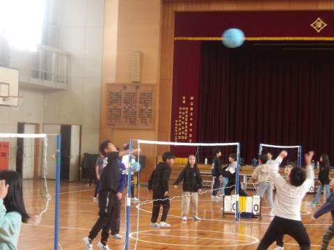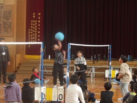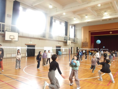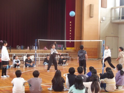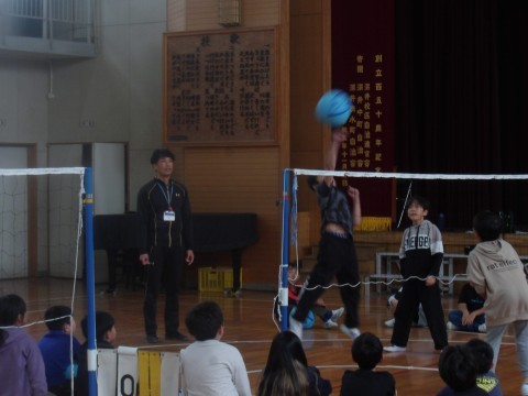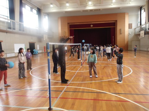 体育館の体育では,「バレーボール」の研究授業を行います。それまで,ボールのつなぎ方などを先生と一緒に練習をしています。