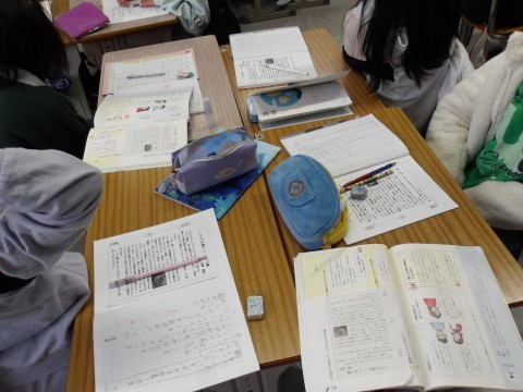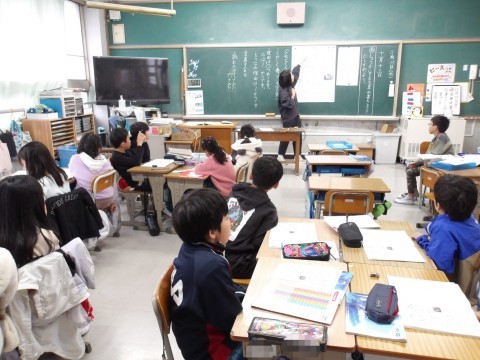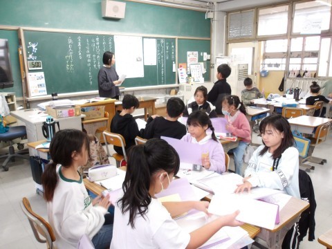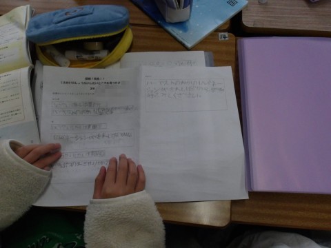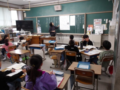 国語と総合的な学習の時間の合科授業では,紹介する文章の書き方を確かめます。