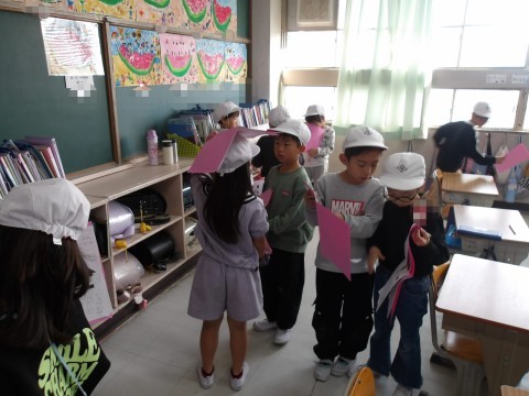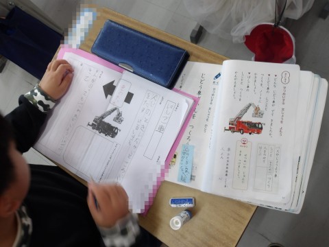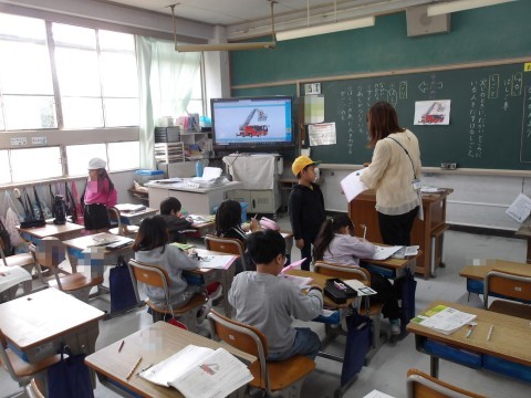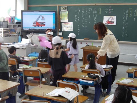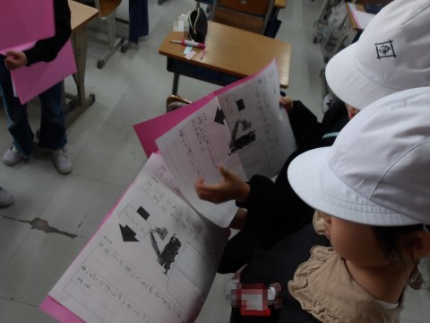 こちらのクラスでは,「はしご車」についてまとめたことを友だちと共有しています。