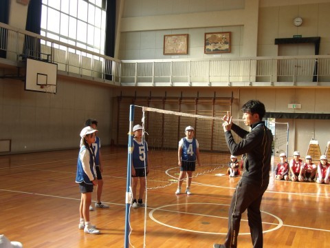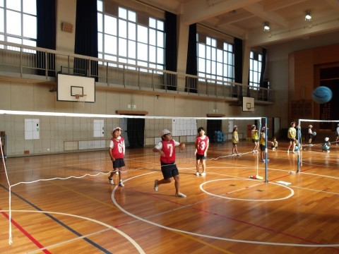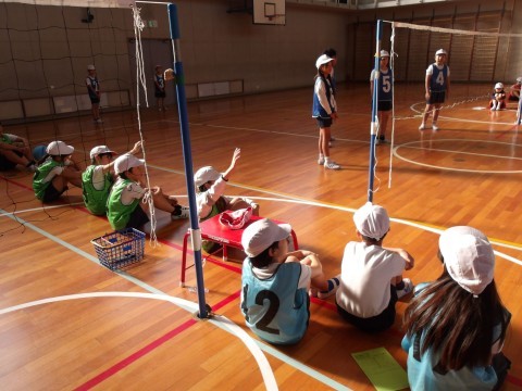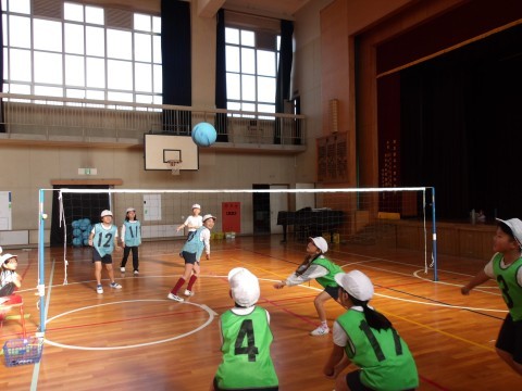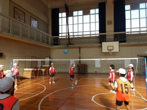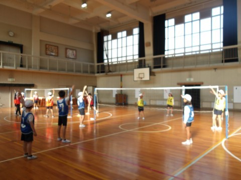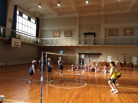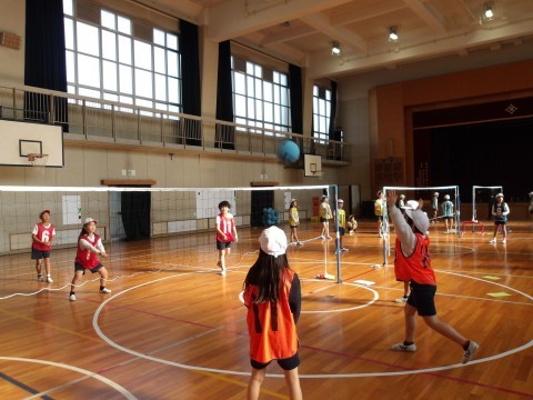 体育館の体育では,「バレーボール」の学習をしています。3回目に相手コートのボールを返すとき,どうやったらミスなくできるかを考えながら取り組みます。「声を掛け合う。」「声を出して協力する。」と,考えながら取り組んでいます。