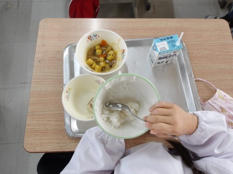 今日の献立は,「カレー豆腐」です。スパイスの香りと豆腐の滑らかさが楽しめるおかずです。カルシウムやたんぱく質を含み,成長に必要な栄養素がたっぷりです。