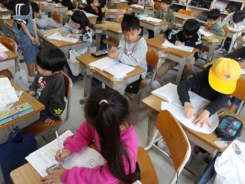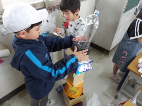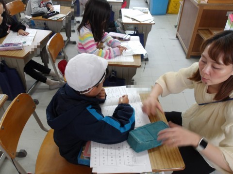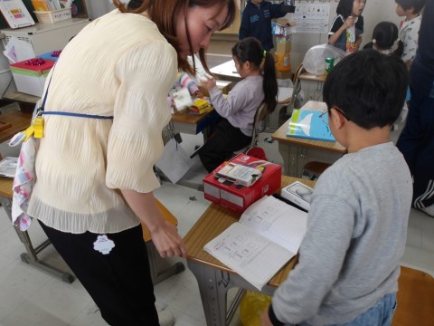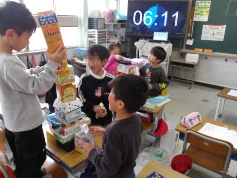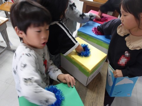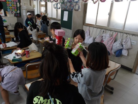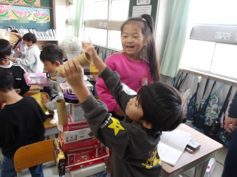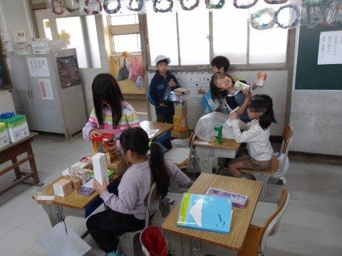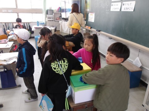 こちらのクラスでは,秘密のボックスに入っている形が何かを考えます。どうやってそのことがわかったか,ワークシートに書きます。