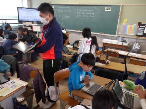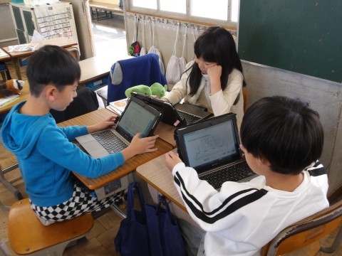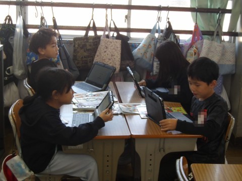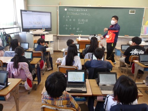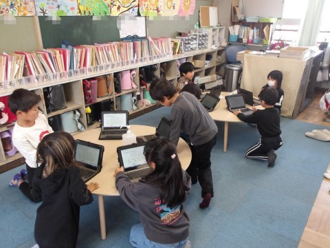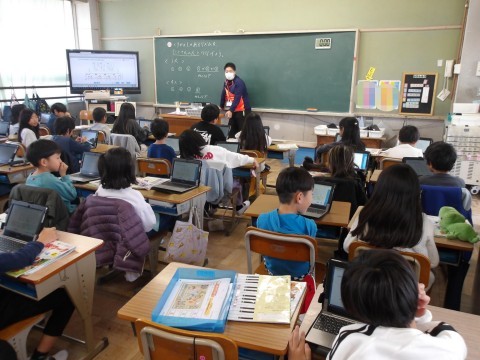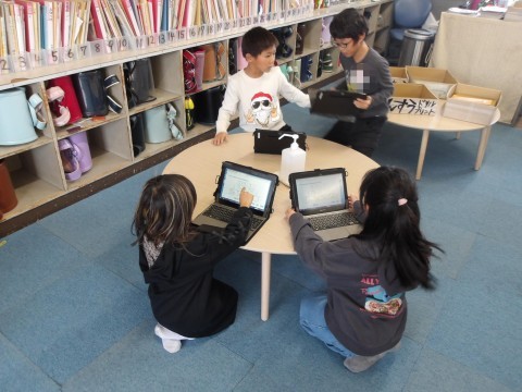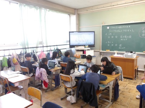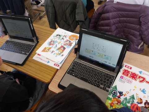 音楽では,タブレットにある音符カードを動かしたり,くり返し使ったりしてリズムを作り,友だちとつないで新たなリズムを作ります。「誰のリズムで終わったらよいか」や「きれいなリズムの組み合わせはどれか」などを意識して,作ります。