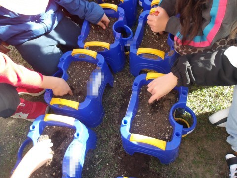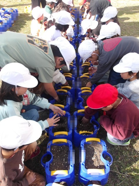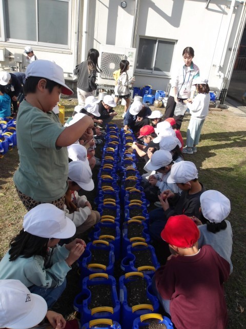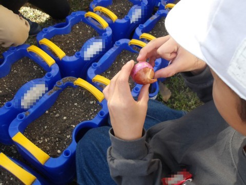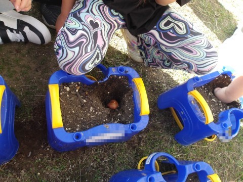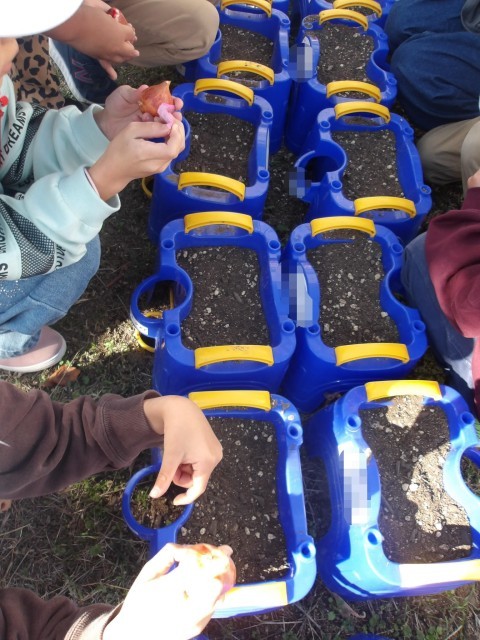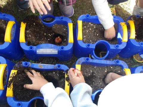 1年生は,チューリップの球根を植えました。寒い冬を越せるように,しっかりと深く穴を掘って,入れてあげます。春,新入生を迎えるチューリップです。大きく育ちますように。