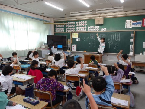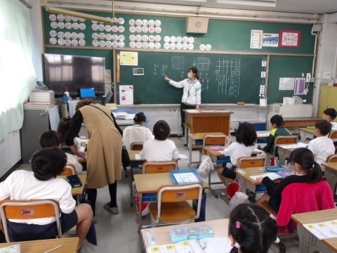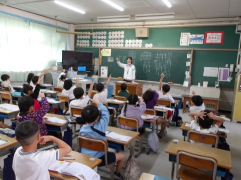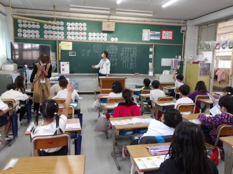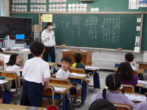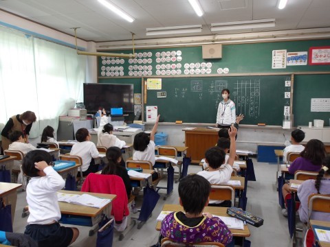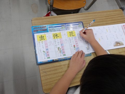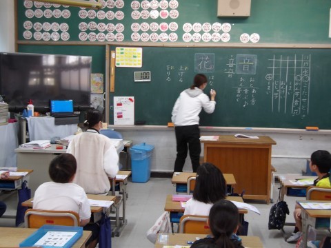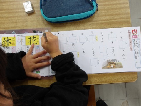 漢字の学習をしています。新しく習った漢字の使い方を3回読んで,その漢字を使った言葉を発表します。空書きでは,先生が「とめ」や「はらい」を丁寧に説明しています。
