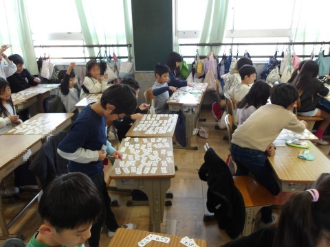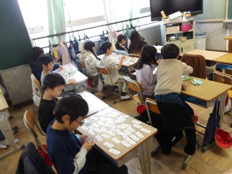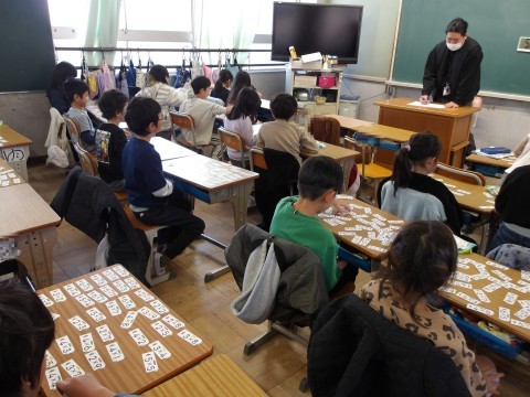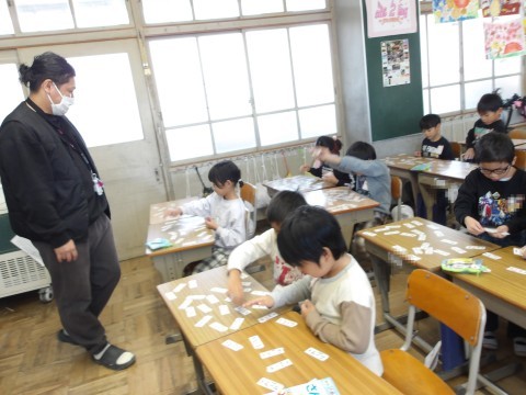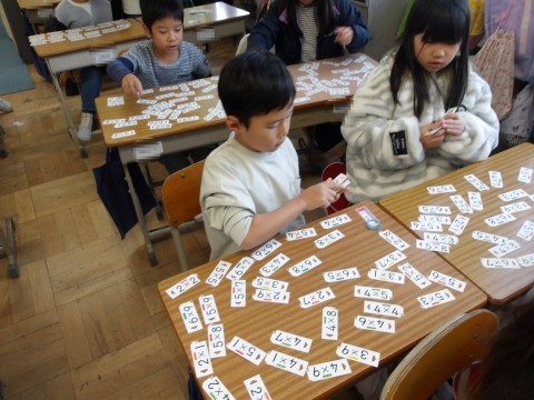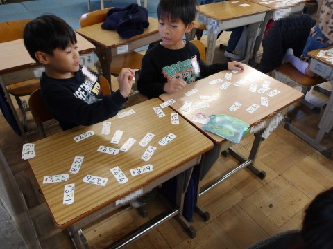 算数のかけ算では,かけ算カードを使って,先生が言う数字に当てはまるかけ算の式を見つけます。