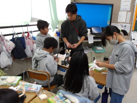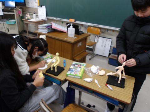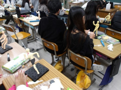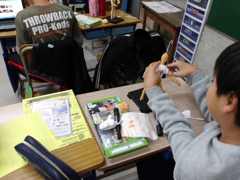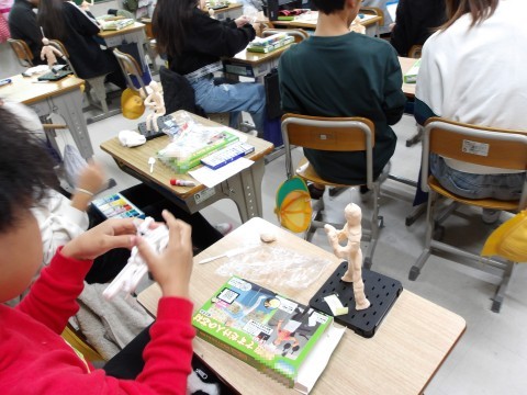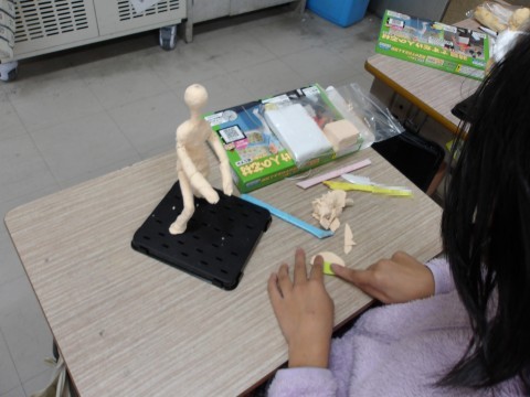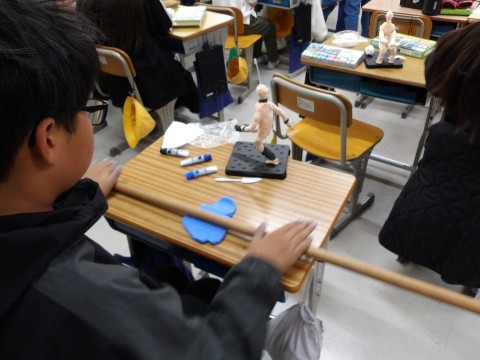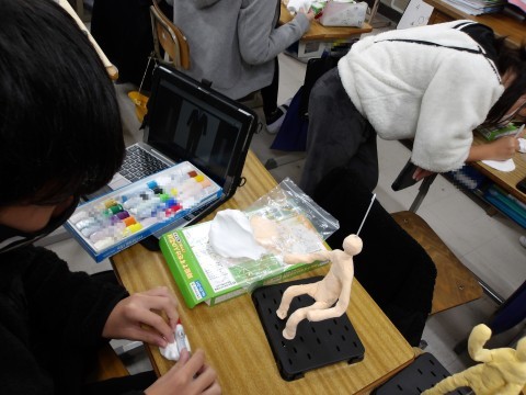 図工では,針金を芯にして紙粘土で人を形づくります。タブレットの映像を参考に制作している人もいます。