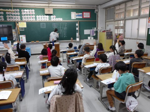 漢字の学習です。新しく習った漢字を使った言葉を手を挙げて発表しています。