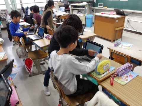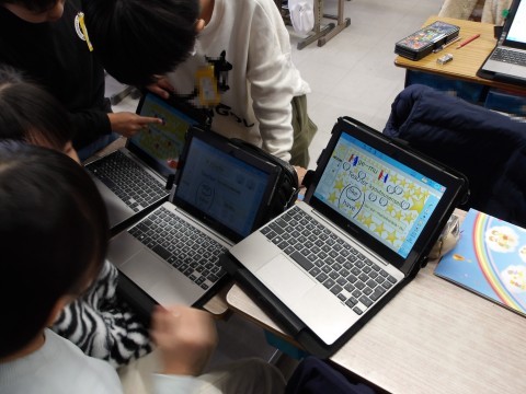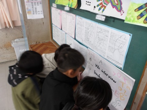 英語では,発表ノートを使ってグループワークをしています。インタビューしたことをクラスの友だちに伝えます。