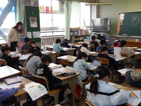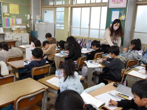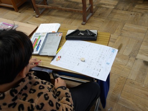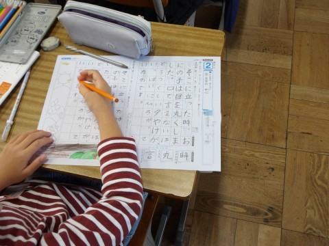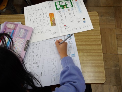 書写の学習をしています。文字の中心に気を付けながら書きます。