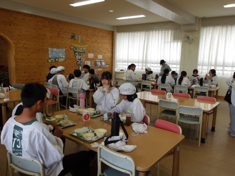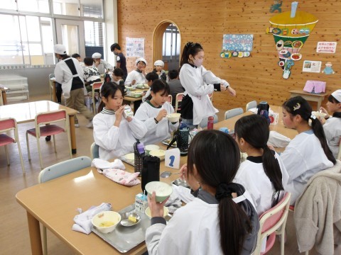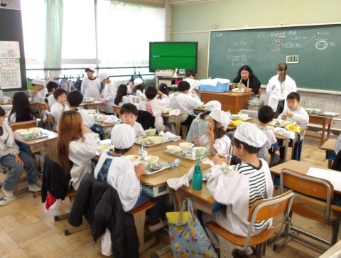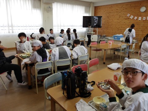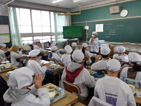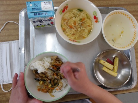 今日の献立「ビビンバ」は,韓国語「ビビン」は混ぜる,「バ」はご飯を意味しています。今日は,スプーンを使って混ぜご飯にしていただきます。ランチルームでは,6年2組が給食をいただいています。