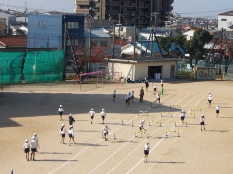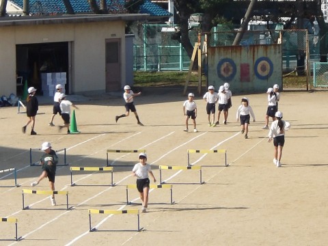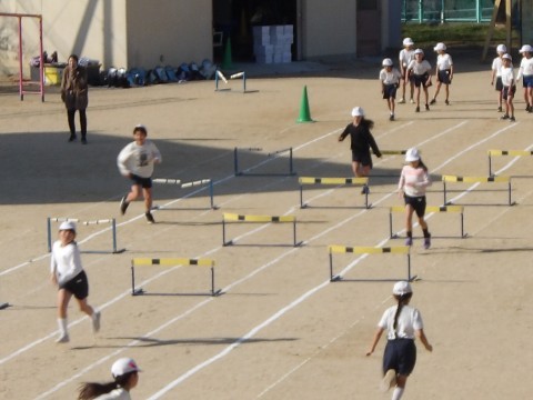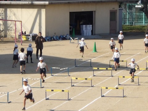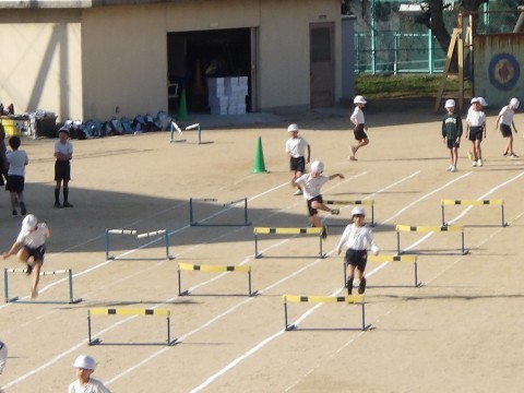 体育では,ハードル走に取り組んでいます。リズムよくとび越えることができています。