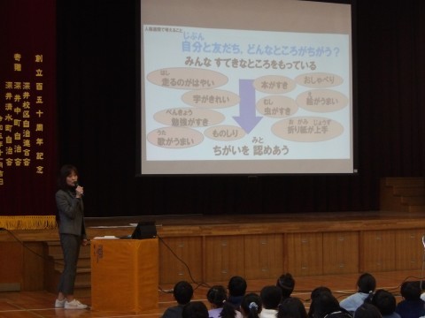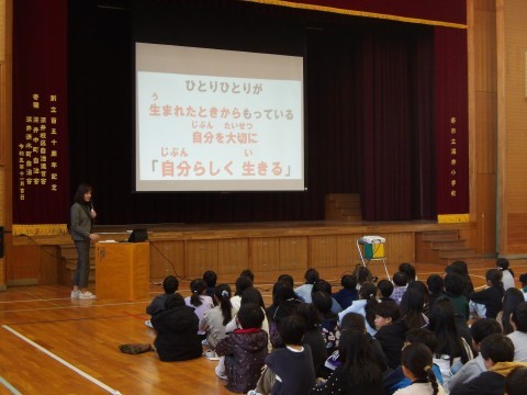 12月の朝会は「人権」について,話がありました。「人権とは,みんな自分らしく生きていいですよ。ということです。12月4日~10日の人権週間に,自分も友だちも,一人ひとりが違うことを知り,自分らしく生きていくためにも,それぞれの違いを大切にすることを考える一週間にしてほしいと思います。自分のよいところや好きなところはどこかを考えてみたり,友だちの素敵なところはどこかを発見したりしてみましょう。そして,自分と友だちの違うところを認め合いながら,自分や友だちの素敵なところをどんどん見つけて,それぞれの得意なことを活かし助け合えたらいいですね。これらを考えることができたら,世界にも目を向けてみましょう。いろいろな人や暮らしがあります。髪の色,肌の色,瞳の色にも違いがあります。話す言葉も違いますね。でも,一緒なのはみんな同じ”ひとりの人”ということ。学校では,人権に関する本の読み聞かせ,校長室前には中図書館から借りた50冊の本を設置しベンチで読めるようにしています。この一週間,みんなが自分らしくいるために,これからのことを考えて過ごしましょう。」と話がありました。