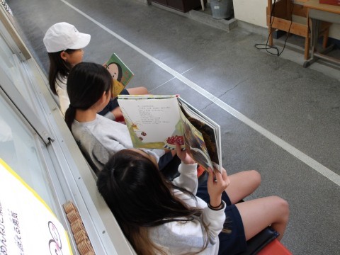 朝会で紹介した,校長室前の中図書館からお借りした「人権」の本を,4年生が早速手に取って読んでいます。